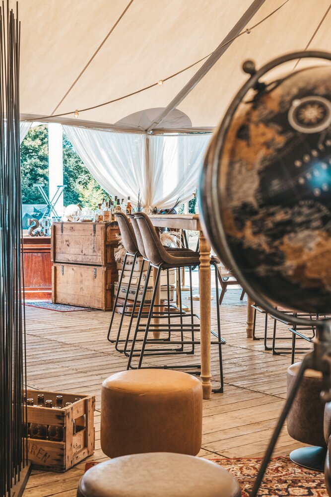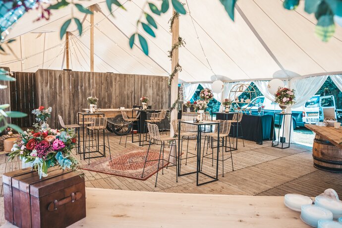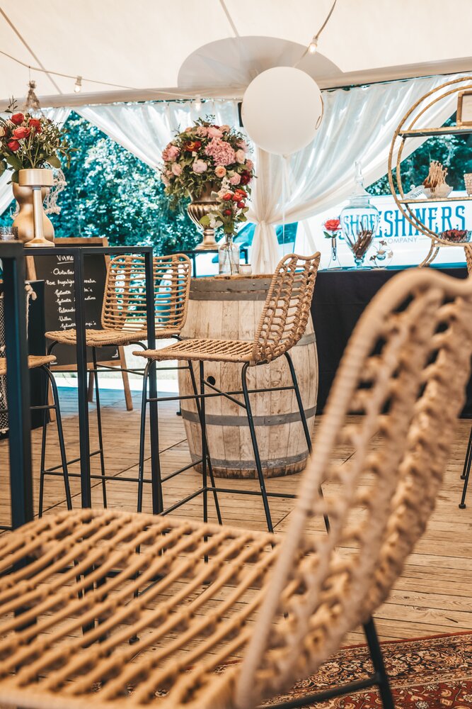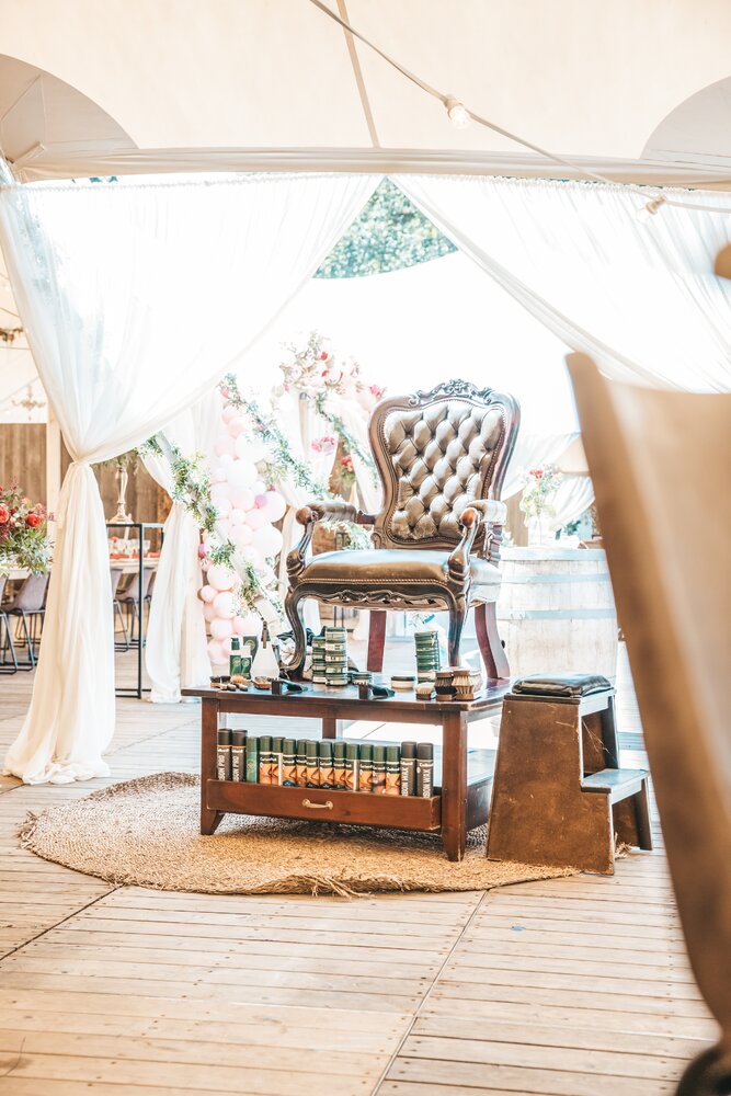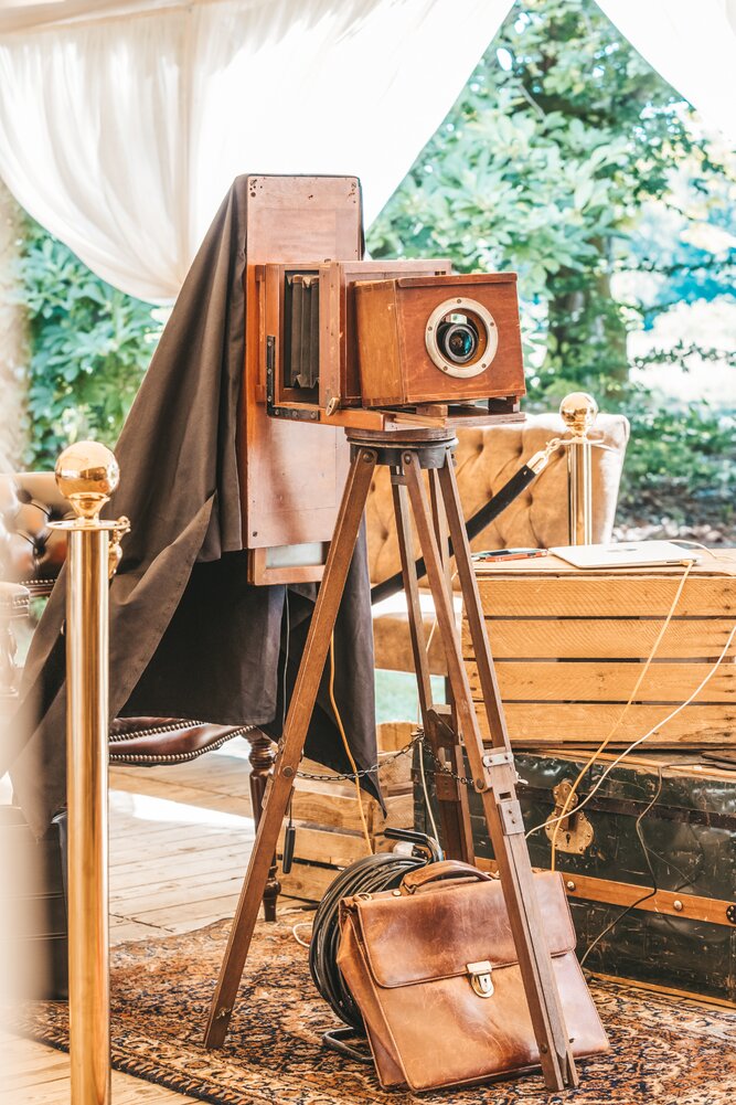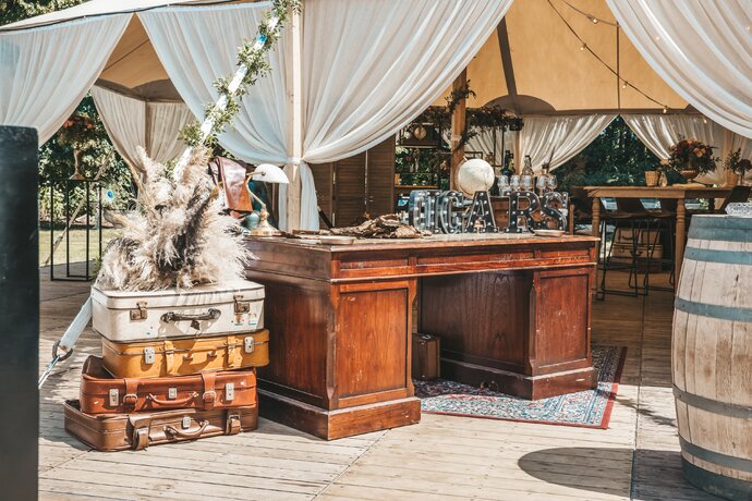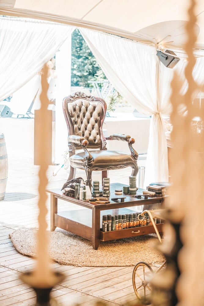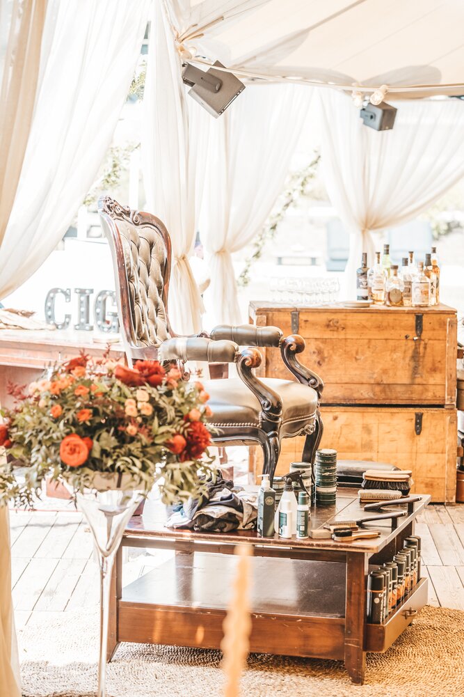 Langs de linker- en rechterkant van de tent creëerden we diverse thematische hoekjes en standjes, volledig in Peaky Blinders-stijl: een shoeshiner in chesterfield-stoel, een nagelstyliste, een barbier, een whiskybar en een sigarenroller. De fotograaf stond in ouderwetse Engelse outfit achter een klassiek fotokastje om de gasten in stijl vast te leggen.