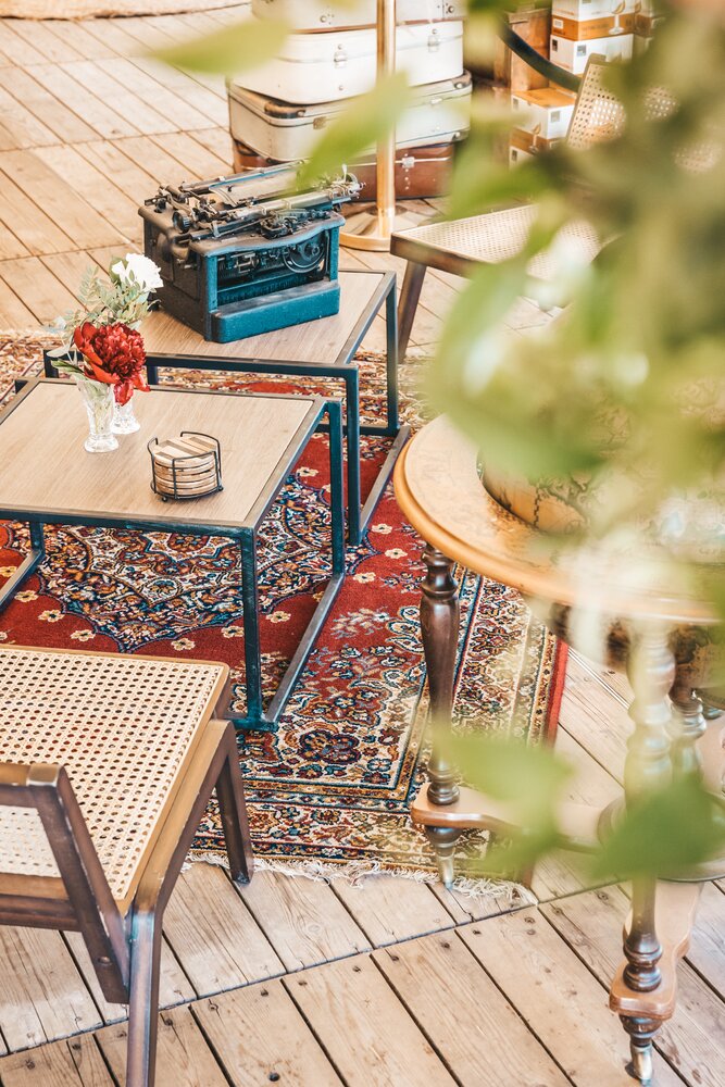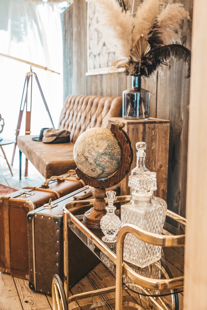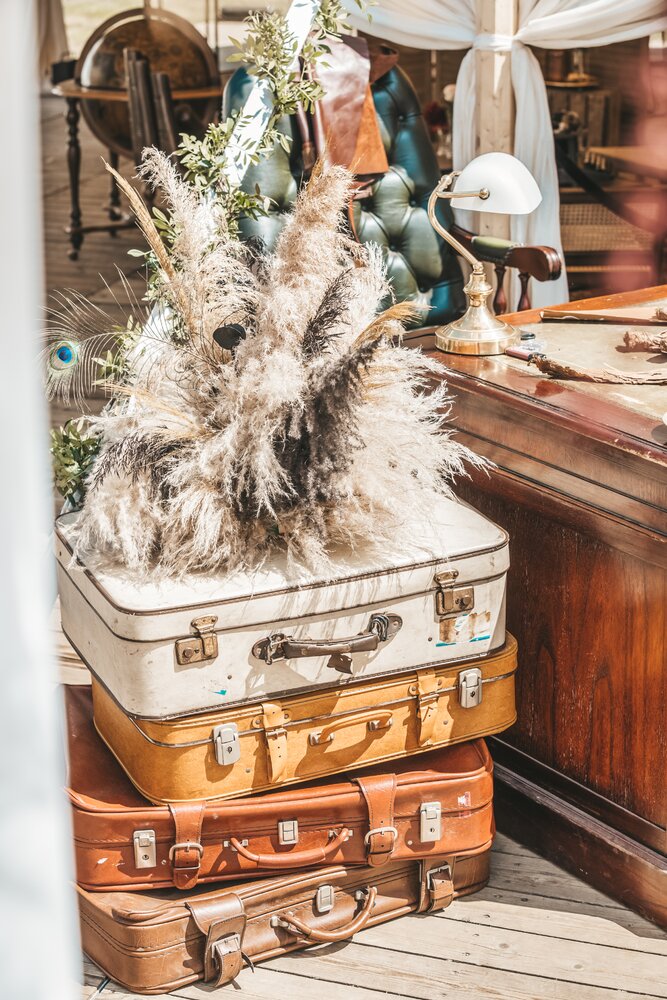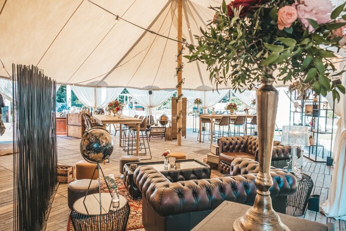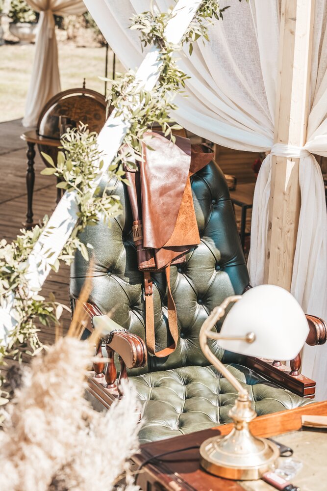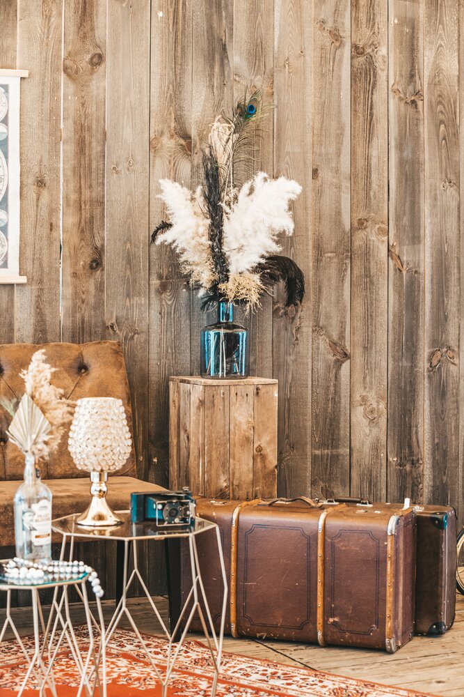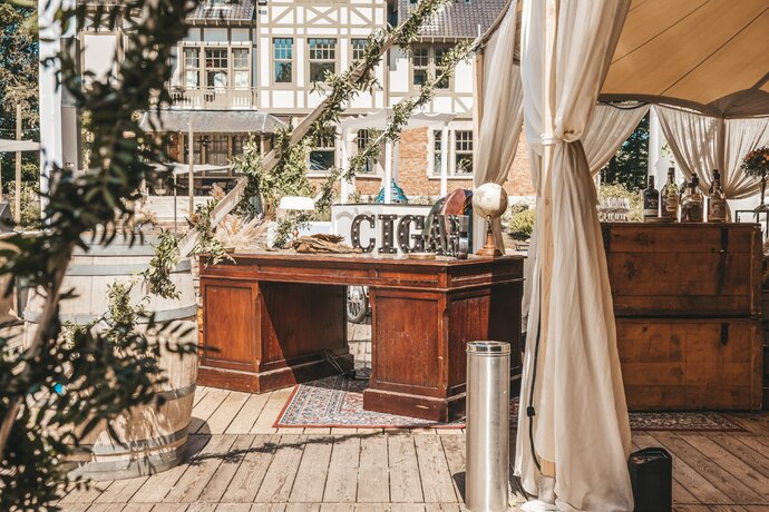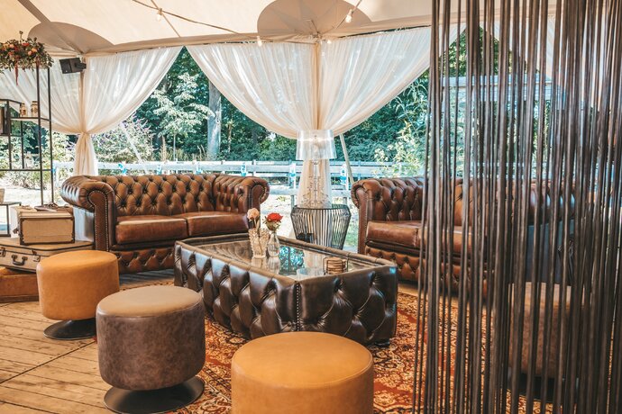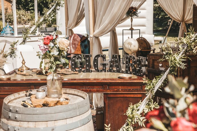 Langs de linker- en rechterkant van de tent creëerden we diverse thematische hoekjes en standjes, volledig in Peaky Blinders-stijl: een shoeshiner in chesterfield-stoel, een nagelstyliste, een barbier, een whiskybar en een sigarenroller. De fotograaf stond in ouderwetse Engelse outfit achter een klassiek fotokastje om de gasten in stijl vast te leggen.
