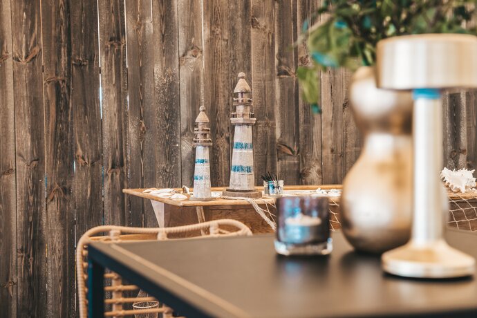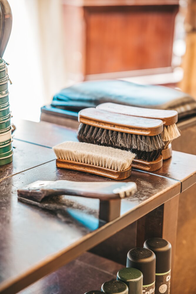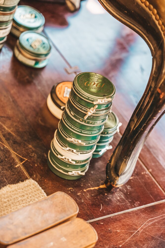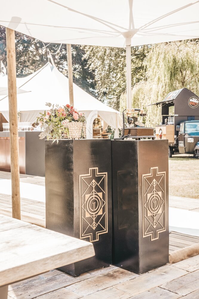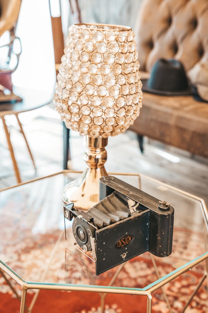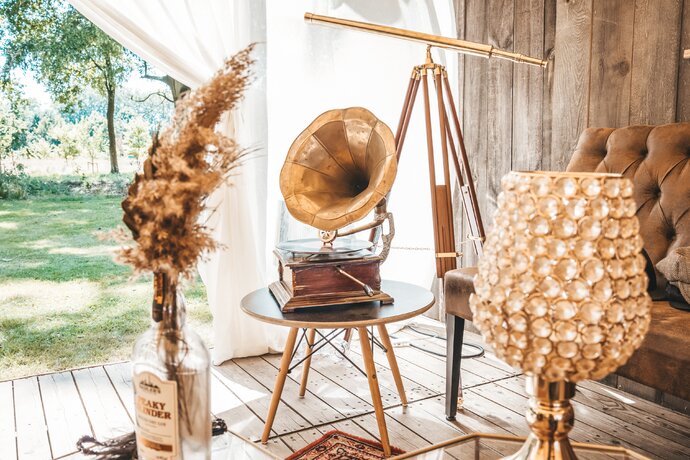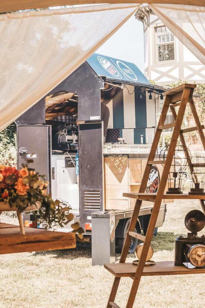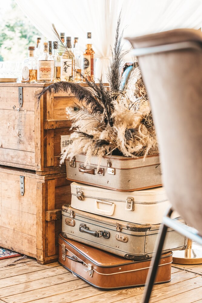 Langs de linker- en rechterkant van de tent creëerden we diverse thematische hoekjes en standjes, volledig in Peaky Blinders-stijl: een shoeshiner in chesterfield-stoel, een nagelstyliste, een barbier, een whiskybar en een sigarenroller. De fotograaf stond in ouderwetse Engelse outfit achter een klassiek fotokastje om de gasten in stijl vast te leggen.