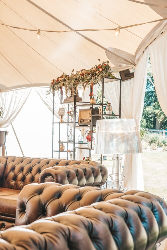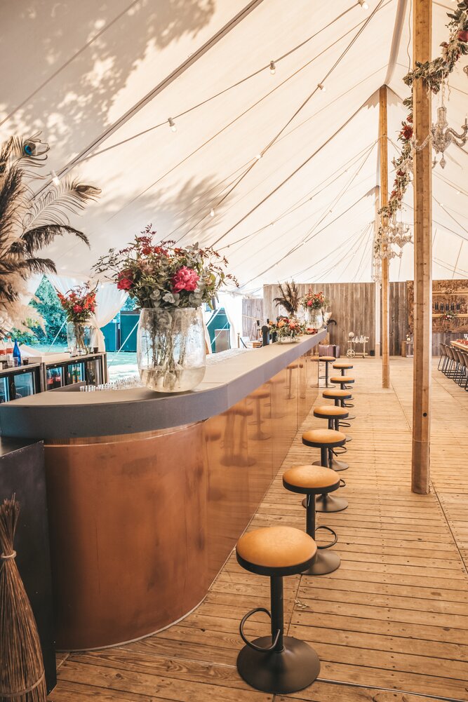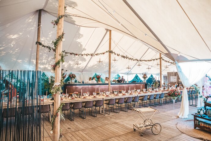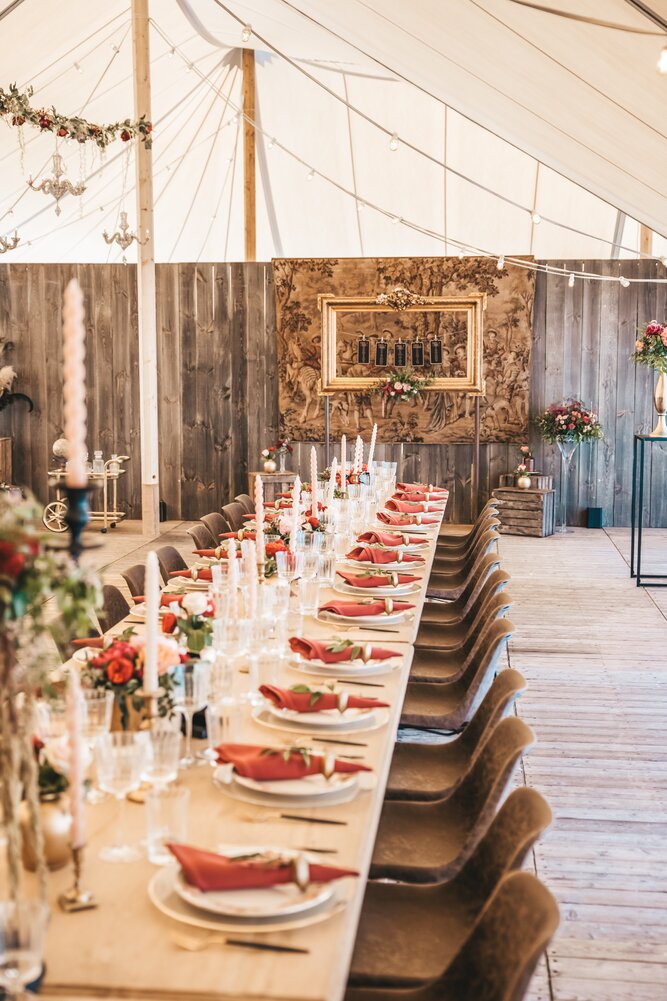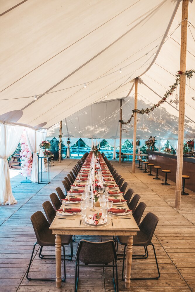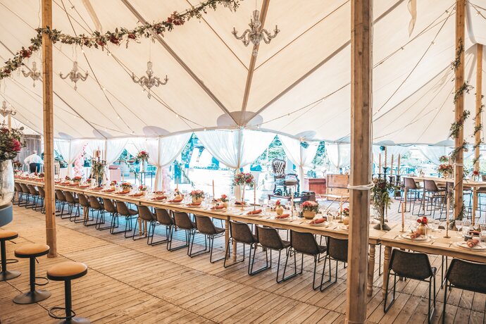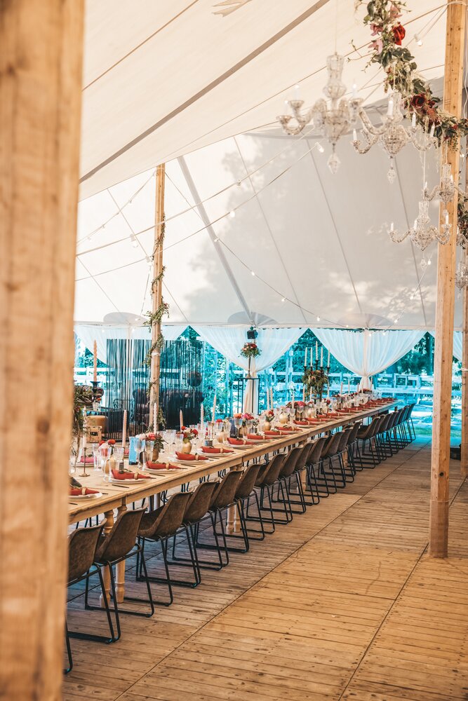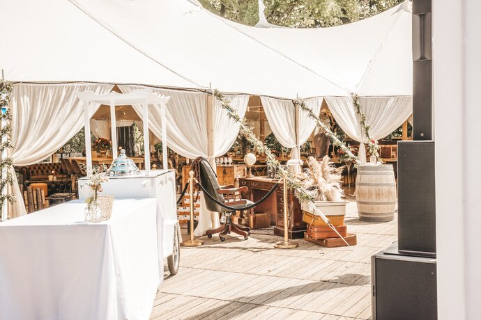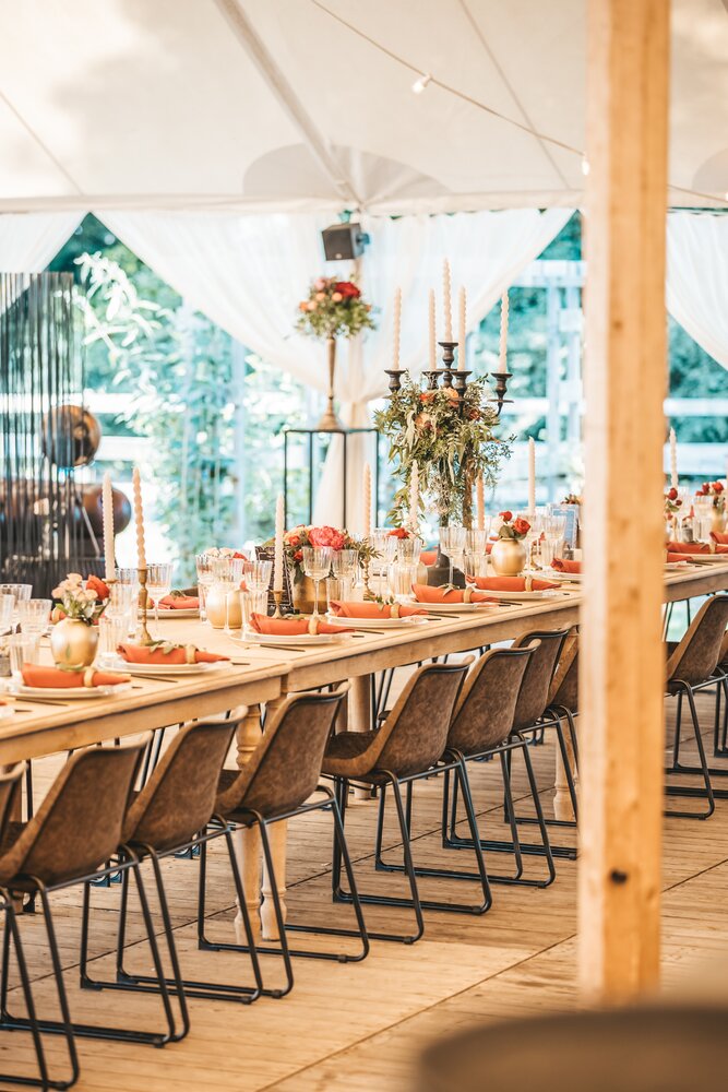Voor dit bijzondere huwelijk mochten wij de prachtige tuin van het koppel in Zwijnaarde omtoveren tot een helemaal Peaky Blinders-beleving. Centraal stond een grote sailcloth tent in U-vorm, met in het midden een long table prachtig ingedekt en daarbuiten een groot terras met podium voor de optredens.