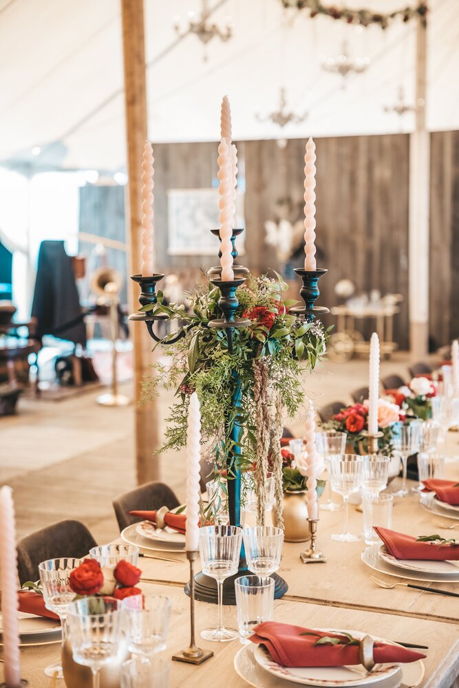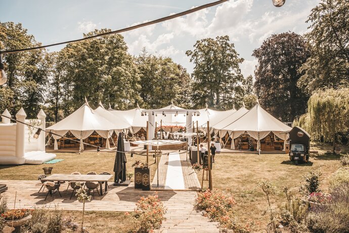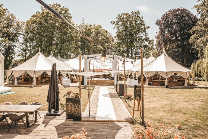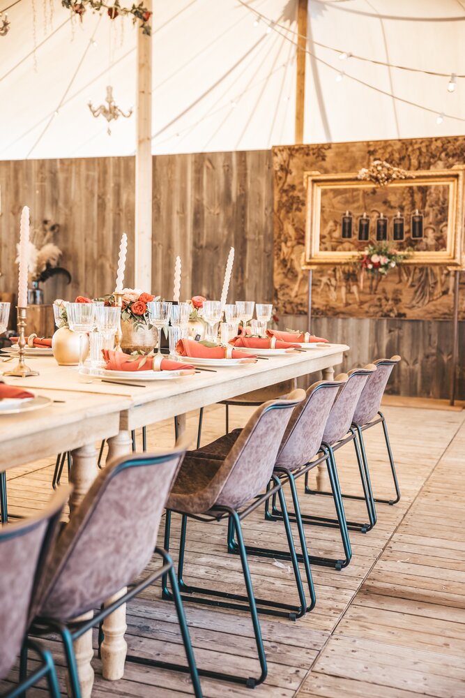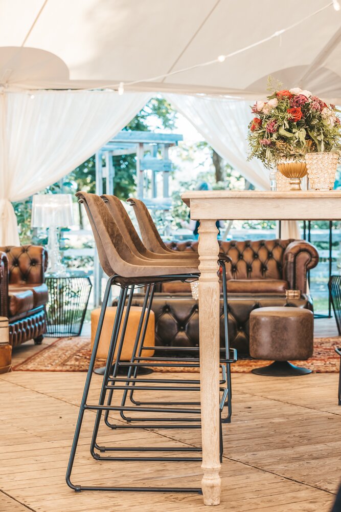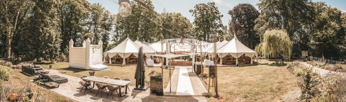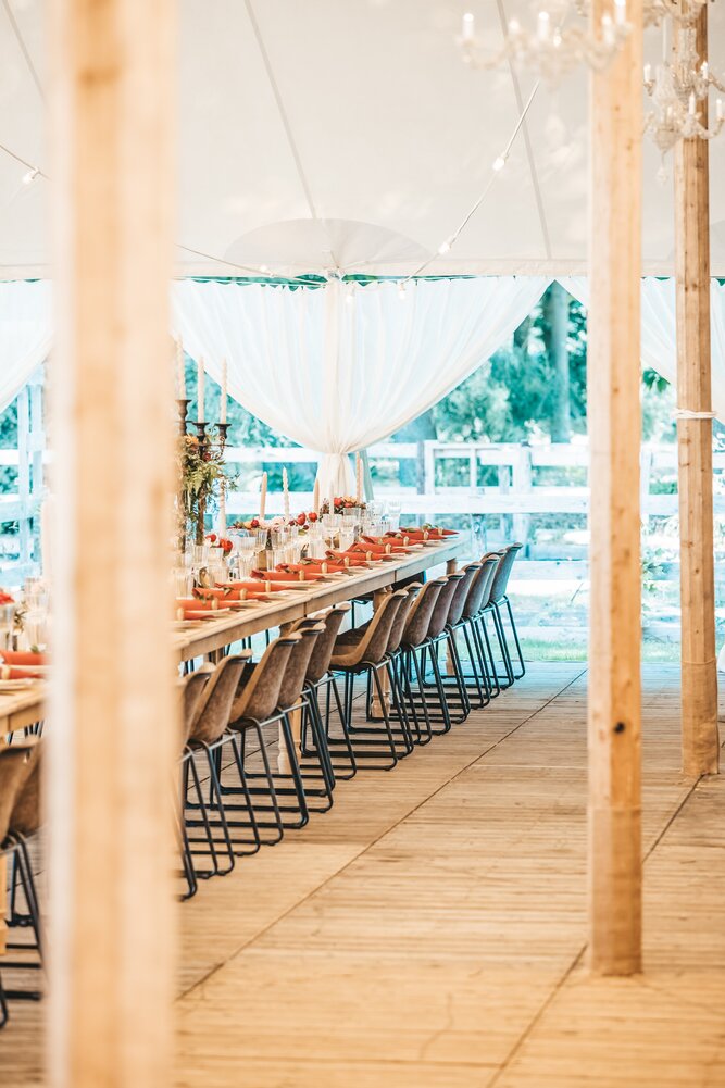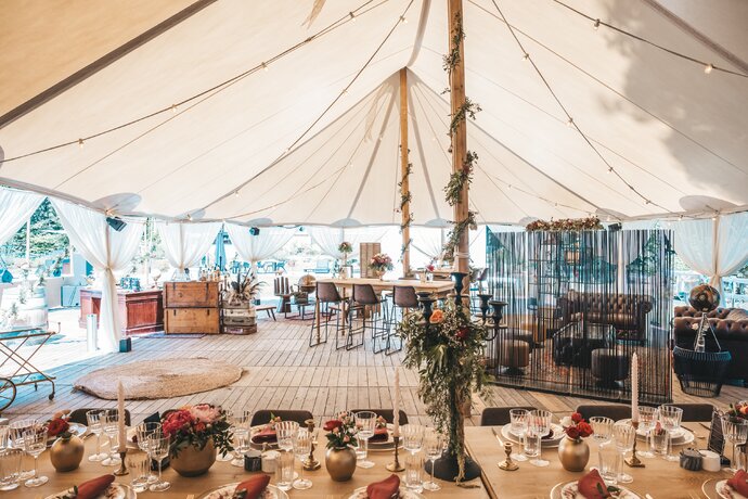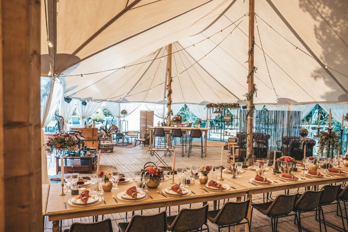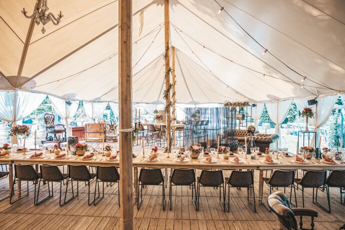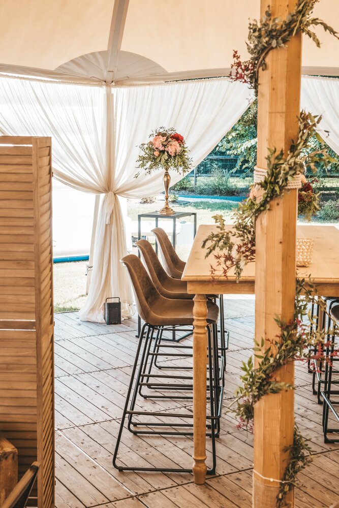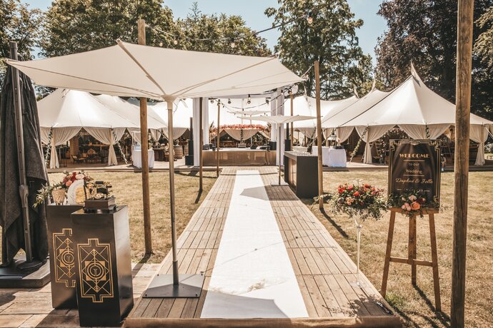 Voor dit bijzondere huwelijk mochten wij de prachtige tuin van het koppel in Zwijnaarde omtoveren tot een helemaal Peaky Blinders-beleving. Centraal stond een grote sailcloth tent in U-vorm, met in het midden een long table prachtig ingedekt en daarbuiten een groot terras met podium voor de optredens.