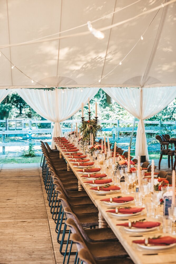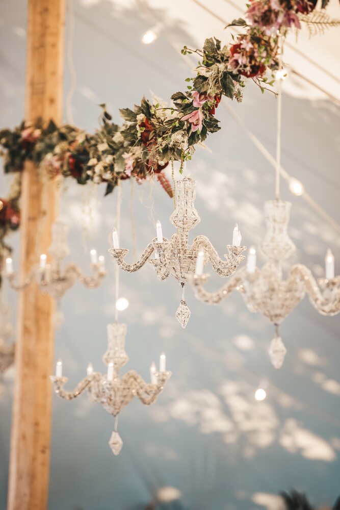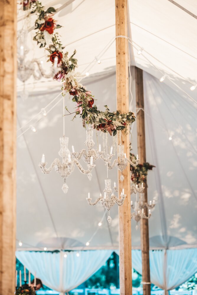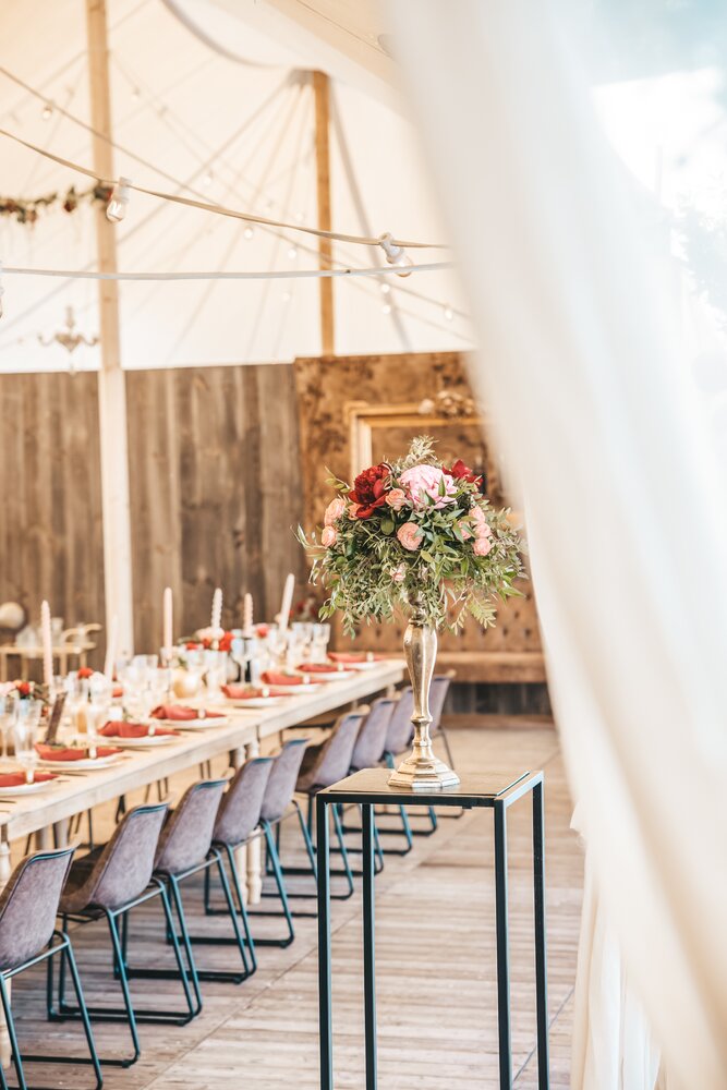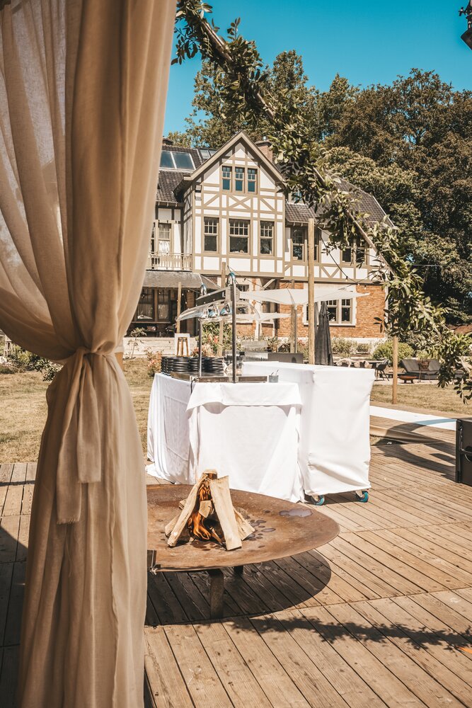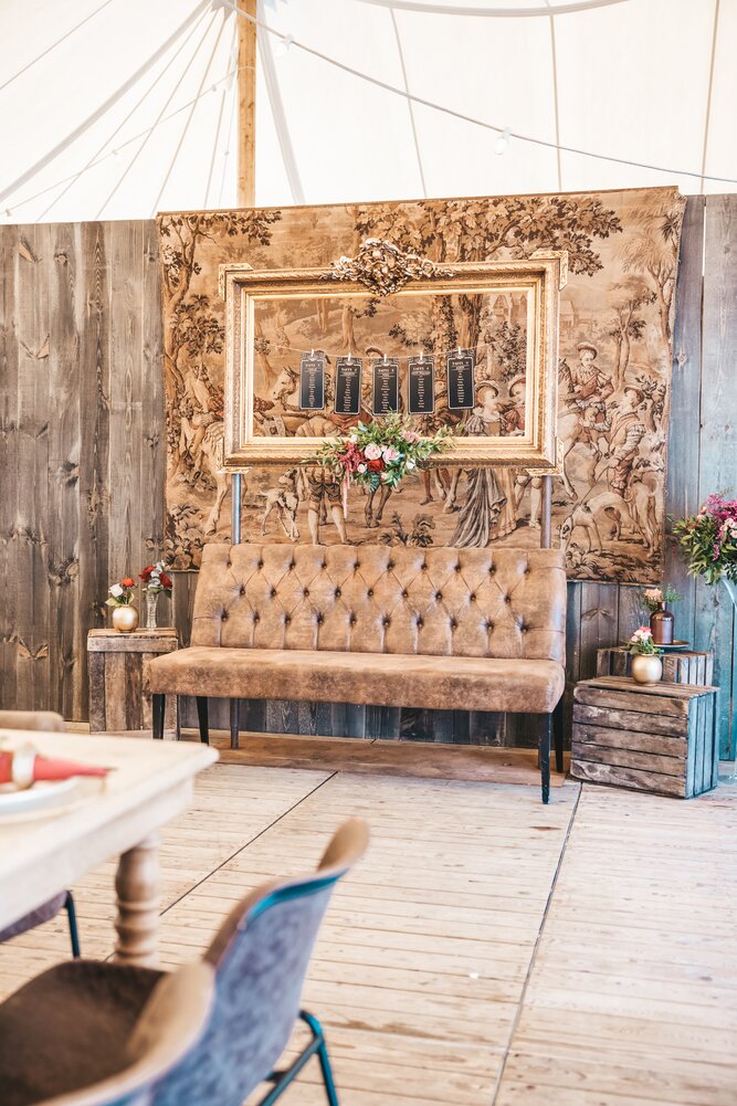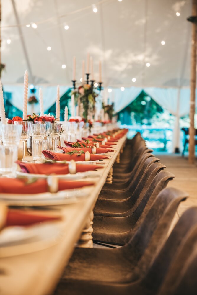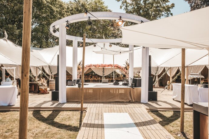 Voor dit bijzondere huwelijk mochten wij de prachtige tuin van het koppel in Zwijnaarde omtoveren tot een helemaal Peaky Blinders-beleving. Centraal stond een grote sailcloth tent in U-vorm, met in het midden een long table prachtig ingedekt en daarbuiten een groot terras met podium voor de optredens.